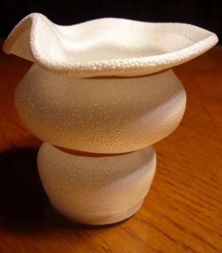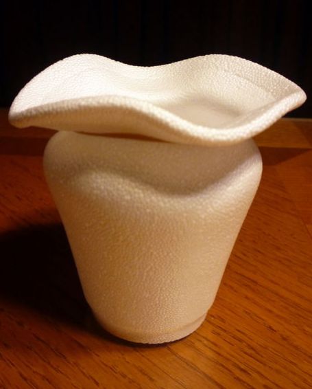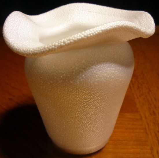 Agora, assim que o copo de isopor estiver com o formato desejado, e para finalizar a sua peça, você deve apagar o fogo, retirar a panela do fogão e o recipiente de dentro da panela, e esperar esfriar o seu copo de isopor já modelado em formato de vaso sinuoso. Retire o elástico depois de frio. E está pronto!
