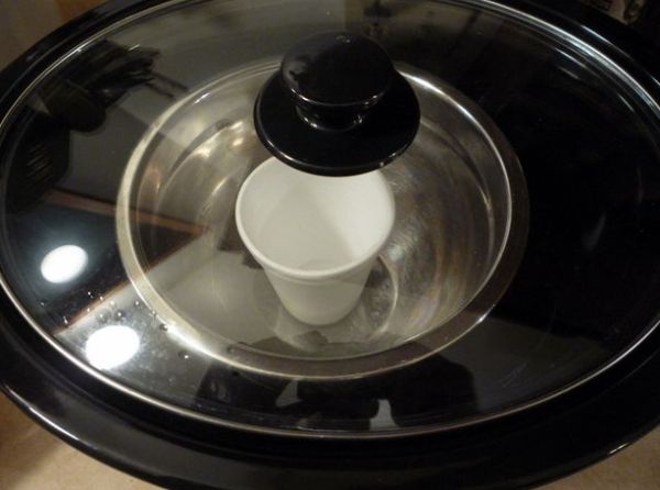 Em seguida, posicione o seu copo de isopor dentro do recipiente que será utilizado no banho-maria, e posicione este recipiente dentro da panela escolhida com um pouco de água. Tampe a panela.