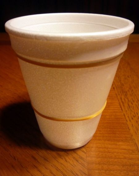 Comece posicionando um, dois o quanto de elásticos de dinheiro você quiser, em seu copo de isopor, pois são eles que permitem conseguir as formas sinuosas em seu vaso que será criado, deixando-o com visual mais diferenciado e interessante para acomodar as suas flores.